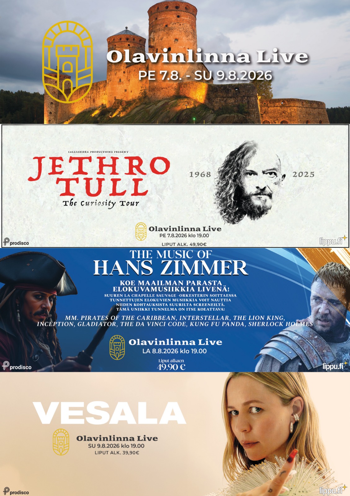 Tänä vuonna menestyksekkään paluun tehnyt Olavinlinna Live järjestetään jälleen perjantaista sunnuntaihin 7.-9. elokuuta 2026. Savonlinnassa sijaitsevan Olavinlinnan jyhkeiden muurien sisällä, luonnonkauniin Saimaan syleilyssä päästään nauttimaan progelendena Jethro Tullin konsertista, loppuunmyydyille saleille esitetystä Hans Zimmer World-konsertista sekä keikkalavoille ensi vuonna palaavan Vesalan konsertista. Olavinlinna Live 2026 -konserttien lipunmyynti alkaa tänään.