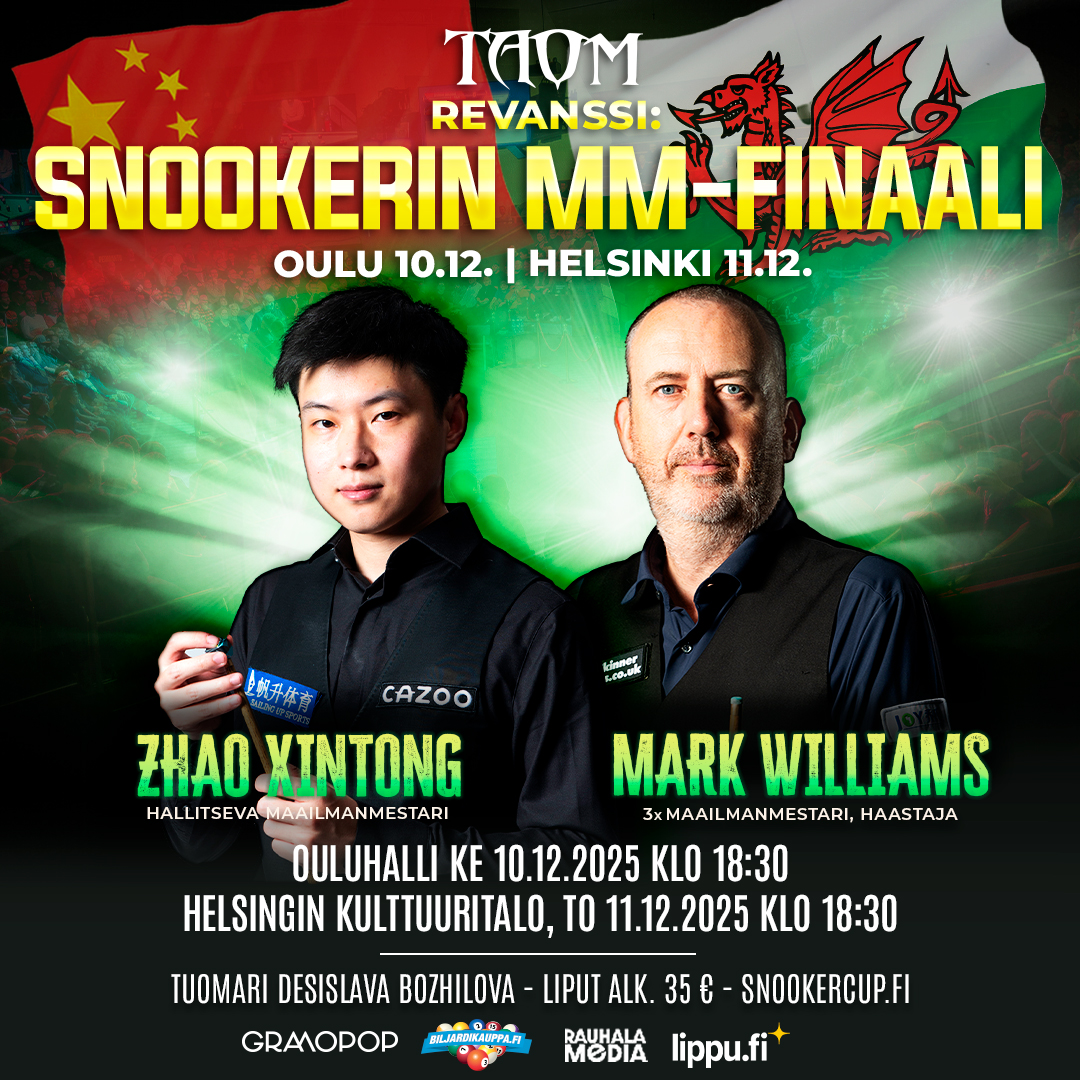 Snookerin ystäville on luvassa todellista herkkua joulukuussa 2025, kun Suomi saa isännöidäkseen harvinaiset näytösottelut: vuoden 2025 MM-finaalin uusinnan kahdessa kaupungissa. Vastakkain ovat lajin legenda Mark Williams (Wales) ja hallitseva maailmanmestari Zhao Xintong (Kiina). Revanssi: Snookerin MM-finaali -ottelut pelataan Ouluhallissa keskiviikkona 10.12. ja Helsingin Kulttuuritalolla torstaina 11.12. Tapahtumat ovat ikärajattomia ja lipunmyynti alkaa perjantaina 30.5. klo 12.00 Lippu.fi:ssä.