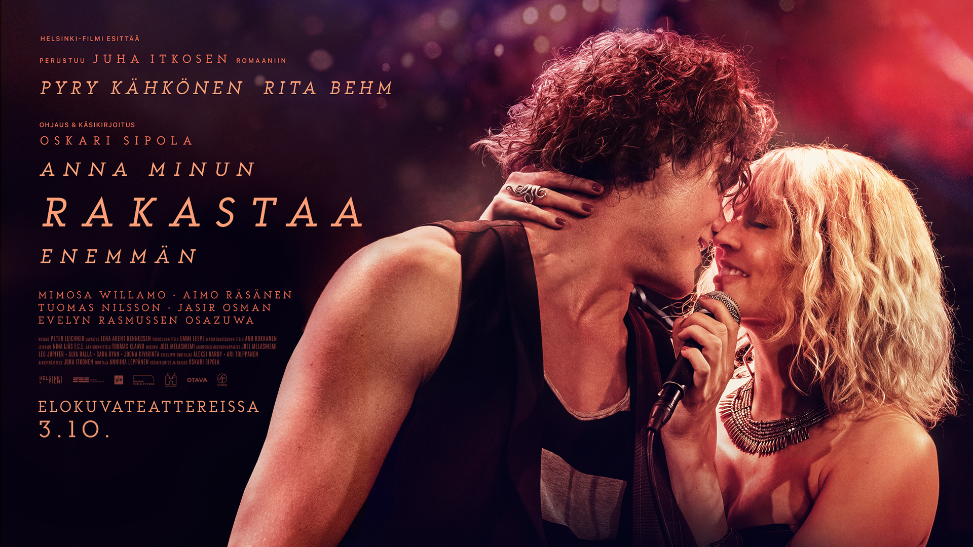 - Omaa tulkintaani romaanista tehdessä olen saanut luotsata suunnattoman lahjakasta ja ammattitaitoista työryhmää. Pyry Kähkönen ja Mimosa Willamo ovat näyttelijäsukupolvensa kirkkaimmat tähdet, heidän sielukas, itseään säästämätön työskentelynsä Antin ja Elisan rooleissa koskettaa, riipaisee ja naurattaa. Suvina nähdään Rita Behm. Hänen heittäytymisensä kokonaan uuteen ilmaisukanavaan on ollut minulle inspiroivaa katseltavaa. Ritan luovuus on yhtä ehtymätöntä kuin hänen huumorinsa. Suomalaisille viime vuosien aikana rakkaaksi muodostunut ääni kuullaan nyt aivan erilaisissa kappaleissa, joista vastasi Joel Melasniemi. Hän sävelsi myös elokuvan musiikin ja konsultoi sen pienintäkin yksityiskohtaa - pidän häntä itseni lisäksi elokuvan keskeisenä luovana tekijänä, Oskari Sipola kertoo ja jatkaa: