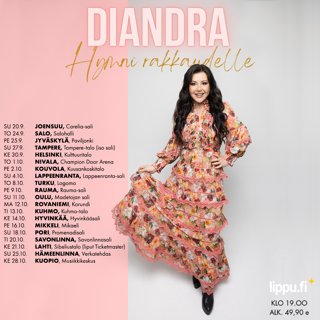 Upeasta äänestään tunnettu Diandra lähtee jälleen syksyllä 2026 koko Suomen kattavalle Hymni rakkaudelle -kiertueelle. Kaksikymmentä konserttia käsittävä kiertue käynnistyy Joensuusta sunnuntaina 20. syyskuuta ja päättyy Kuopioon keskiviikkona 28. lokakuuta. Kiertueen lipunmyynti alkaa tänään.