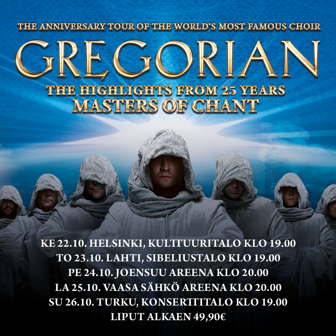 Maailmanlaajuiseen suosioon jo vuoden 1999 Masters Of Chant -albumillaan noussut Gregorian juhlistaa tänä vuonna menestyksekästä uraansa 25 Years Masters Of Chant –juhlakiertueella. Rakastettu kuoro esiintyi juhlakiertueellaan Suomessa täysille saleille jo alkuvuodesta ja nyt syksylle on luvassa lisää samaa herkkua. Gregorian-klassikoita vuosien varrelta sisältävä näyttävä juhlashow vierailee lokakuussa Helsingissä, Lahdessa, Joensuussa, Vaasassa ja Turussa. Konserttien lipunmyynti alkaa tänään.