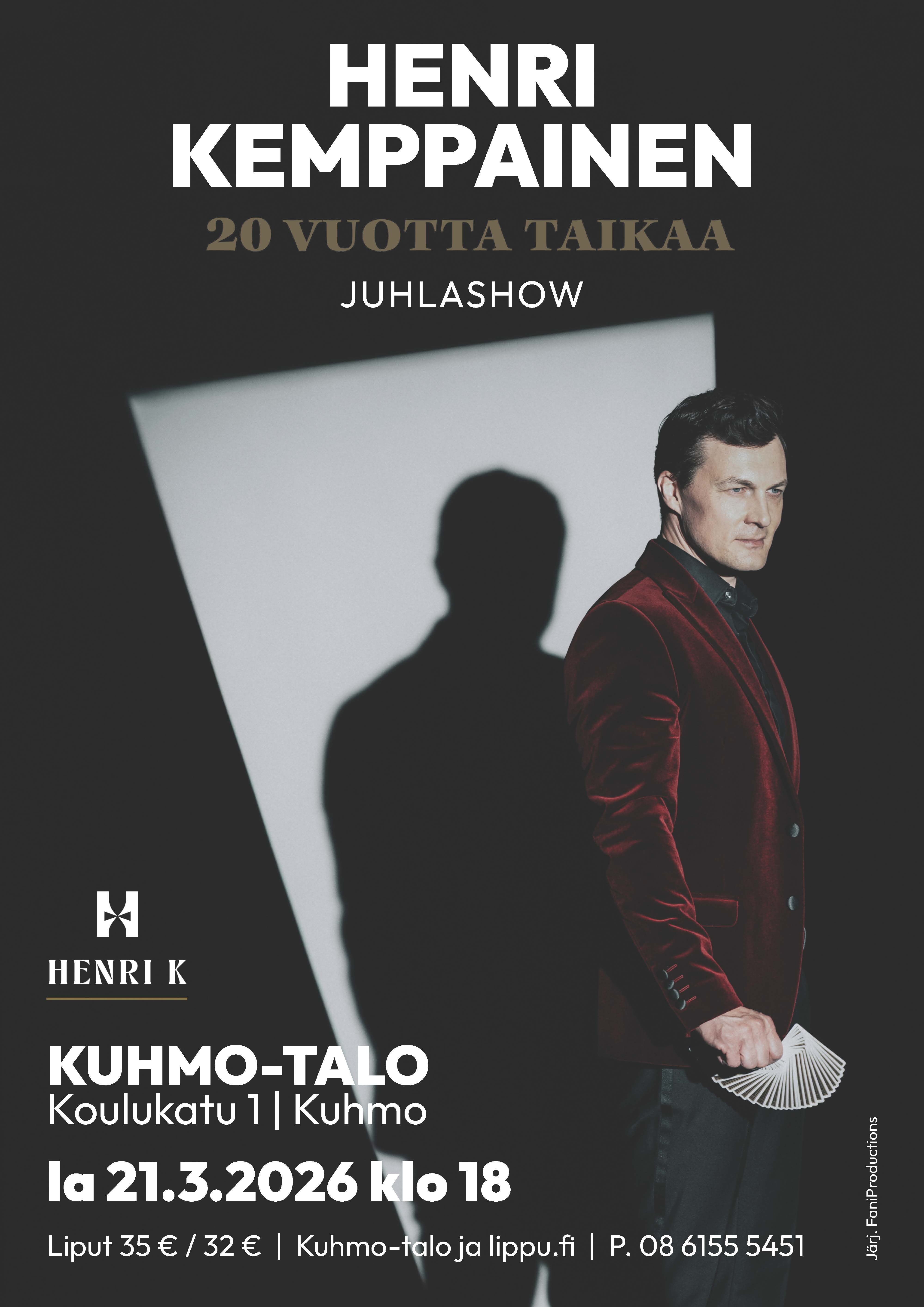 Hyrynsalmelta kansainvälisille estradeille ponnistanut taikuri Henri Kemppainen juhlistaa 20-vuotista taiteilijauraansa näyttävästi kotimaakunnassaan. Upea juhlashow Henri Kemppainen – 20 vuotta taikaa nähdään Kuhmo-talossa lauantaina 21.3.2026. Lipunmyynti alkaa perjantaina 29.8.2025 klo 9.00 Lippu.fi:ssä.