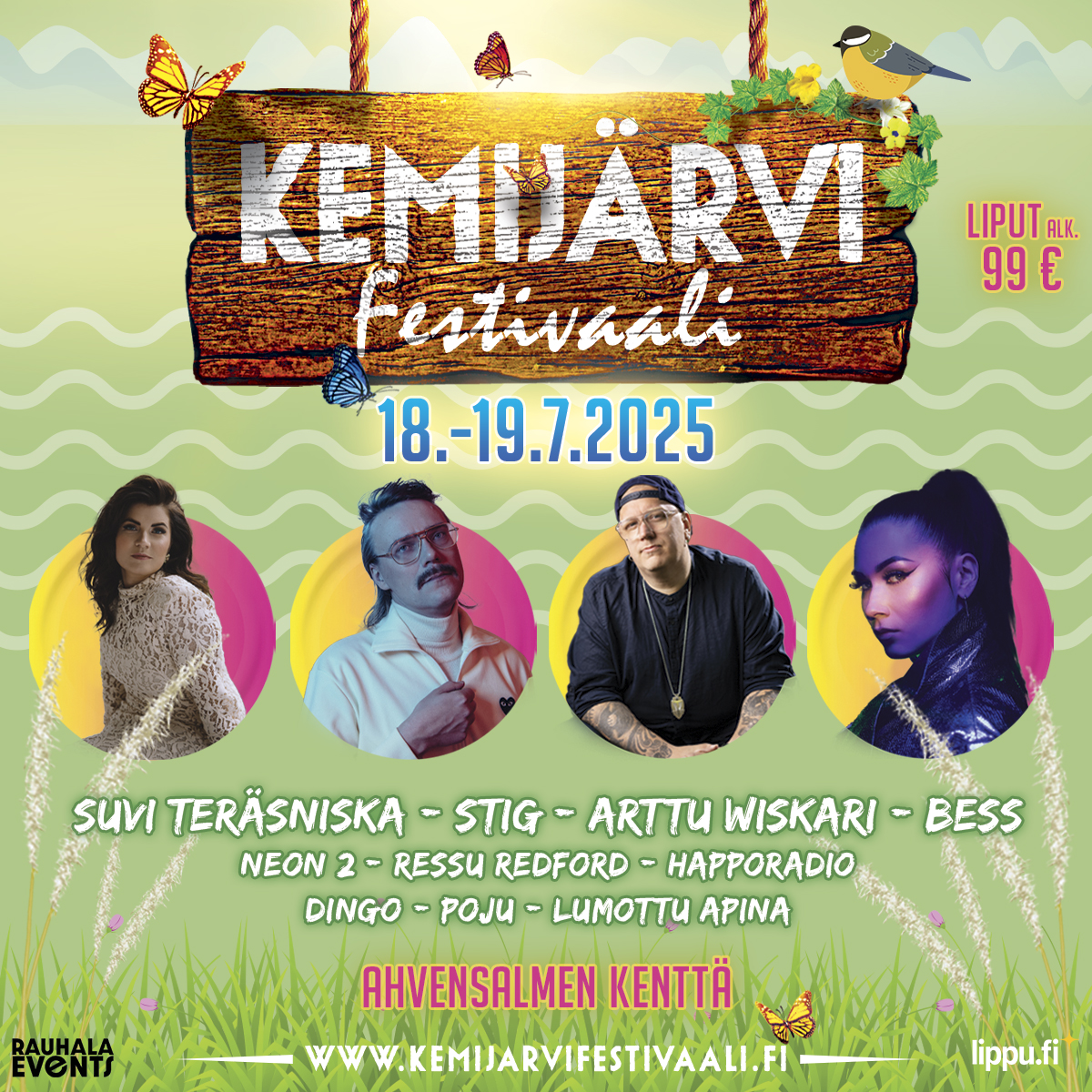 Kemijärvellä päästään nauttimaan ensi kesänä festivaalitunnelmasta, kun uusi Kemijärvi-festivaali rantautuu Ahvensalmen kentälle perjantaista lauantaihin 18.-19.7.2025. Täysi-ikäisille suunnatulla festivaalilla esiintyy kaikkiaan kymmenen kotimaista huippuartistia.
