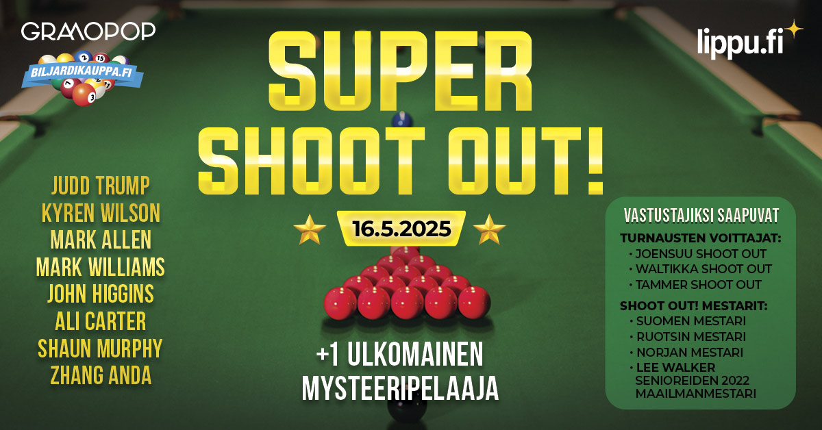 Helsingin Super Shoot Out! -kilpailuun osallistuu TAOM Helsinki International Snooker Cupissakin nähtävät, maailman parhaimmistoon lukeutuvat kahdeksan huippupelaajaa. He saavat vastaansa vuoden 2022 Snookerin senioreiden maailmanmestarin Lee Walkerin, seitsemän haastajaa pohjoismaista ja ulkomaisen mysteeripelaajan, joka paljastetaan vasta tapahtumapäivänä. Pohjoismaiset pelaajat lunastavat paikkansa alla olevien karsintakilpailujen kautta. Illan aikana pelataan yhteensä 15 erää viihdyttävää ja nopeatempoista snookeria, jonka jälkeen voittaja on selvillä.