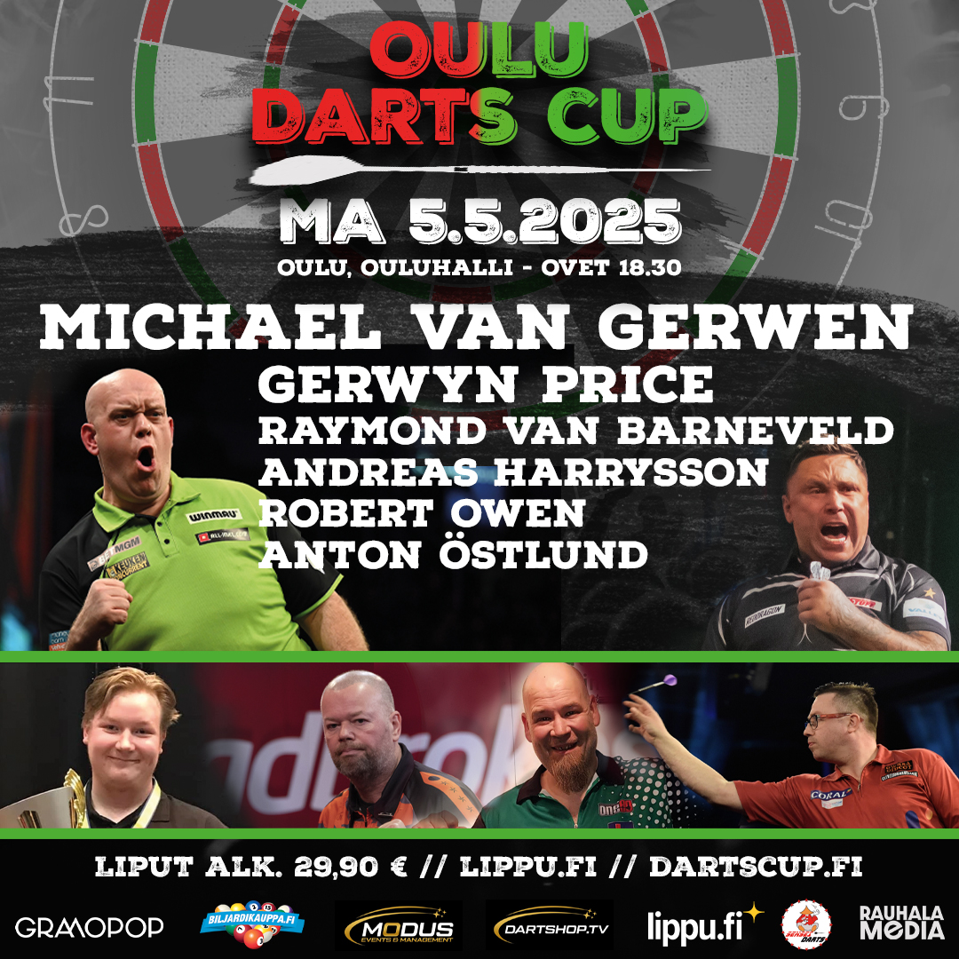 Suomessa eletään tällä hetkellä darts-huumaa. Helsingin jäähallissa viime vuoden lopulla järjestetty Helsinki International Darts Cup veti sunnuntaisena iltana yli 4 000 katsojaa ja vuoden alussa julkistettu Tampere International Darts Cup myi hetkessä loppuun tarjolla olleet reilut 6 000 lippua. Nyt Oulussa päästään nauttimaan maailmanluokan darts-tunnelmasta kun Oulu Darts Cup järjestetään Ouluhallissa maanantaina 5.5.2025. Moninkertaisia dartsin maailmanmestareita sisältävän turnauksen liput tulevat myyntiin maanantaina 20.1.2025 klo 8.00.