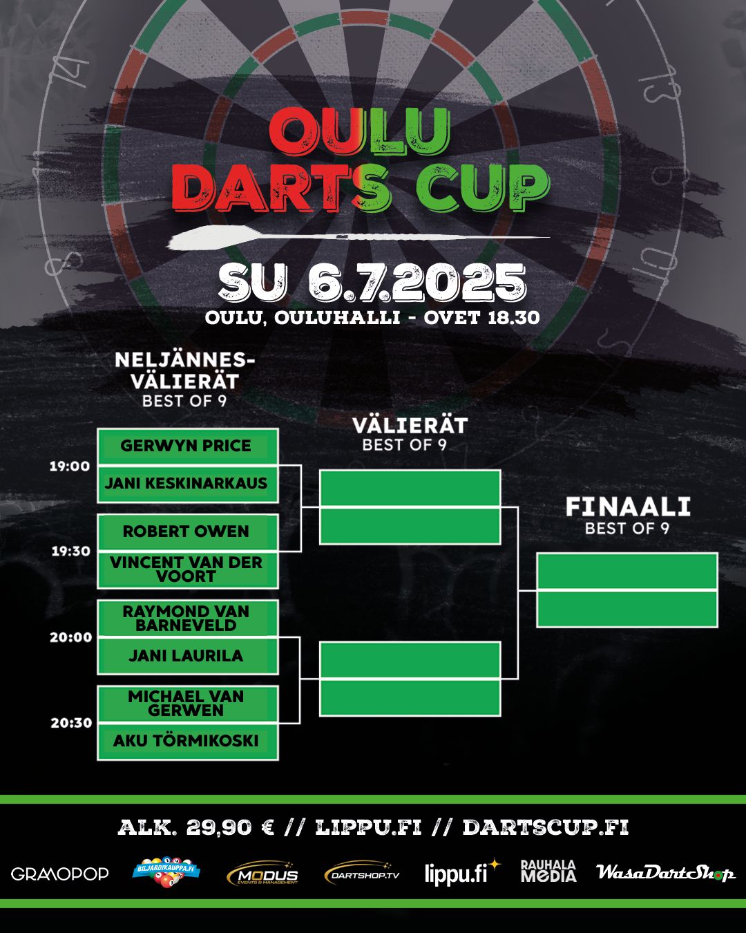 Oulu Darts Cup järjestetään ensimmäistä kertaa sunnuntaina 6. heinäkuuta Ouluhallissa. Tapahtuman alkuperäiseen pelaajalistaan on tullut muutoksia, kun suomalainen Teemu Harju ja kaksi ruotsalaispelaajaa jäävät pois turnauksesta aikataulullisten päällekkäisyyksien vuoksi. He ovat saaneet paikan samana viikonloppuna Tanskassa järjestettävään PDC Nordic & Baltic tour -turnaukseen.